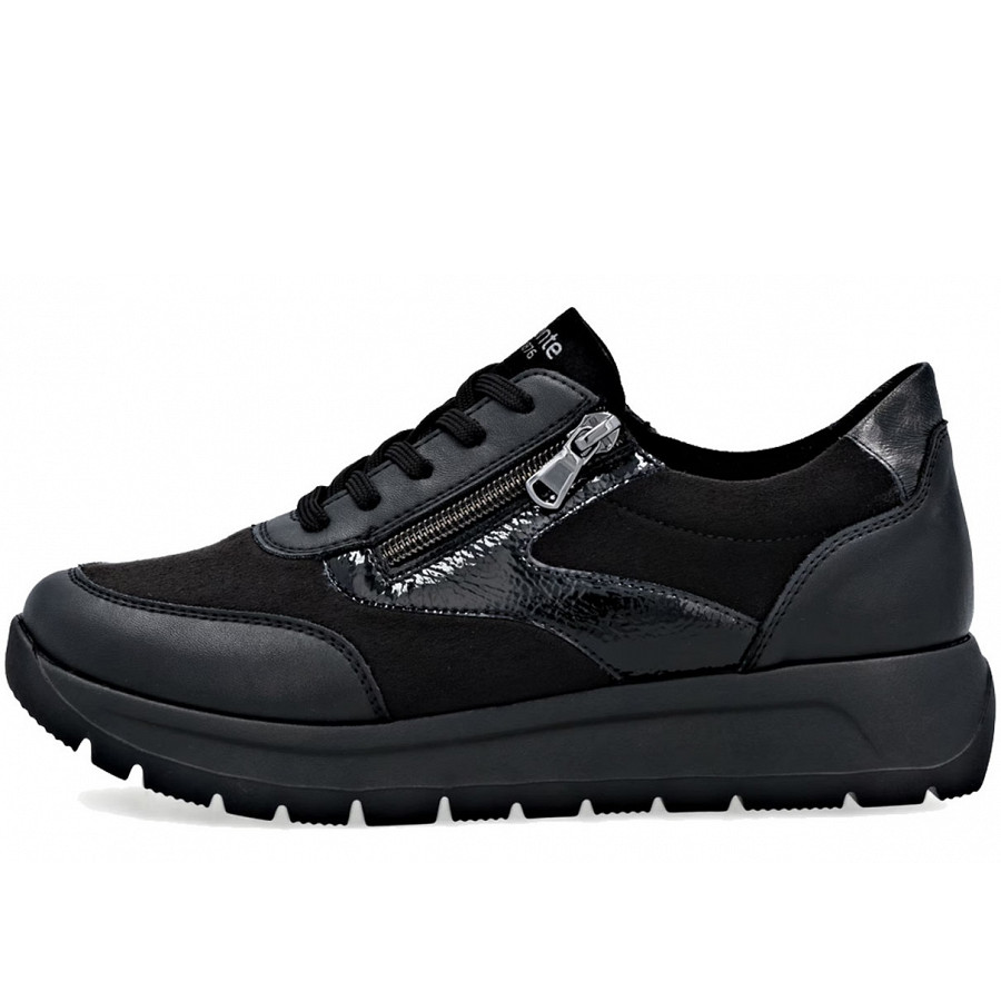 Classy Chic: Diese schwarzen remonte Sneaker für Damen zeigen sich in klassischer Farbgebung, die einfach immer geht! Trotz Schnürung kann der Schuh ganz einfach mit einem Reißverschluss geschlossen werden. Die Lite 'n Soft Technologie kombiniert eine super leichte Sohle mit gepolsterter und herausnehmbarer Einlegesohle. Außerdem ist deinen Füßen durch die Extraweite mehr Bewegungsfreiraum im Vorfußbereich geboten. Die Innenfütterung aus Microvelour ist leicht und atmungsaktiv. We love it!