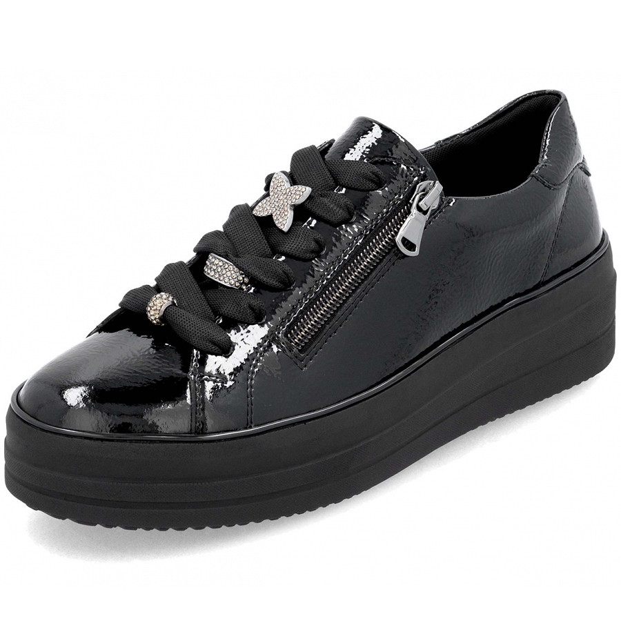 Comfy Queen: Diese schwarzen remonte Sneaker für Damen aus Lackleder begleiten dich mit Style und bestem Laufkomfort durch die Saison. Eine Schnürung ergänzt den Reißverschluss und sorgt für Funktionalität und Komfort. Dank der bewährten remonte Lite 'n Soft Technologie und der gepolsterten und herausnehmbaren Einlegesohle sind die Sneaker federleicht und angenehm zu tragen. Durch die Komfortweite ist den Zehen mehr Bewegungsfreiheit geboten. Das Modell ist mit leichtem Microvelour gefüttert, das atmungsaktiv ist. Mehr Komfort geht nicht!